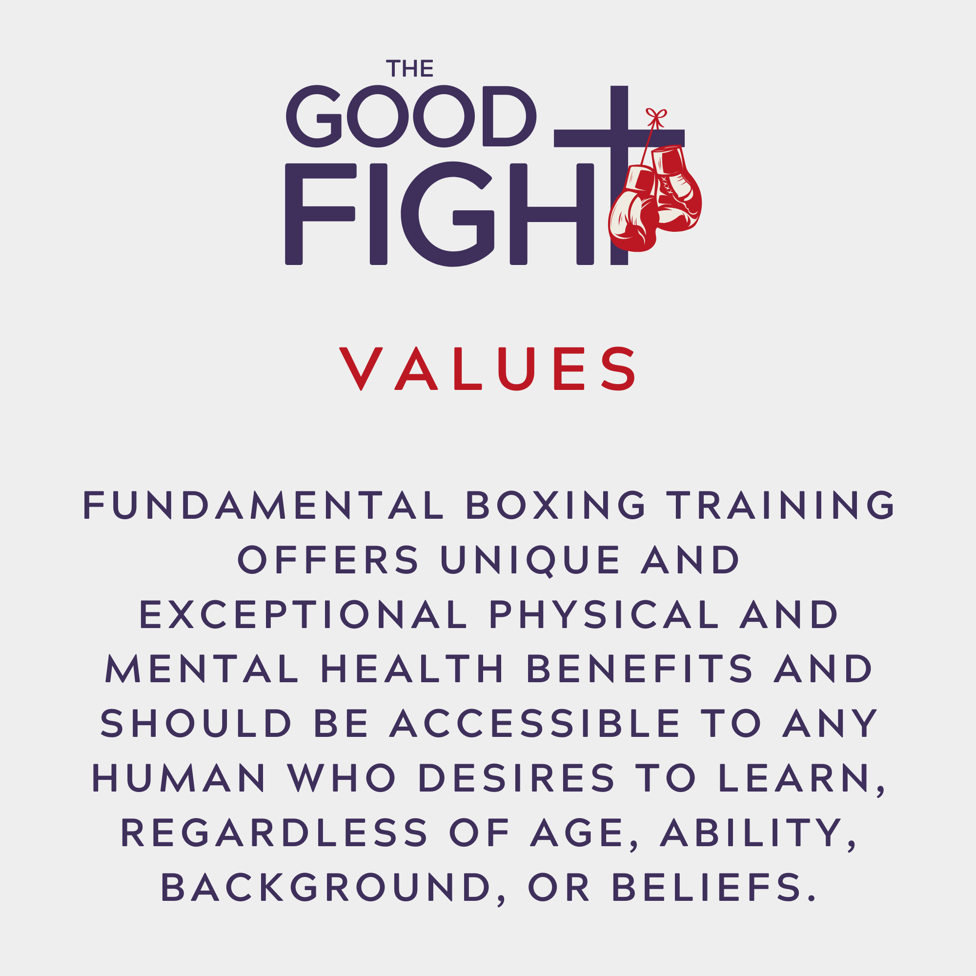 We believe fundamental boxing training offers unique and exceptional physical and mental health benefits and should be accessible to any human who desires to learn, regardless of age, ability, background, or beliefs.