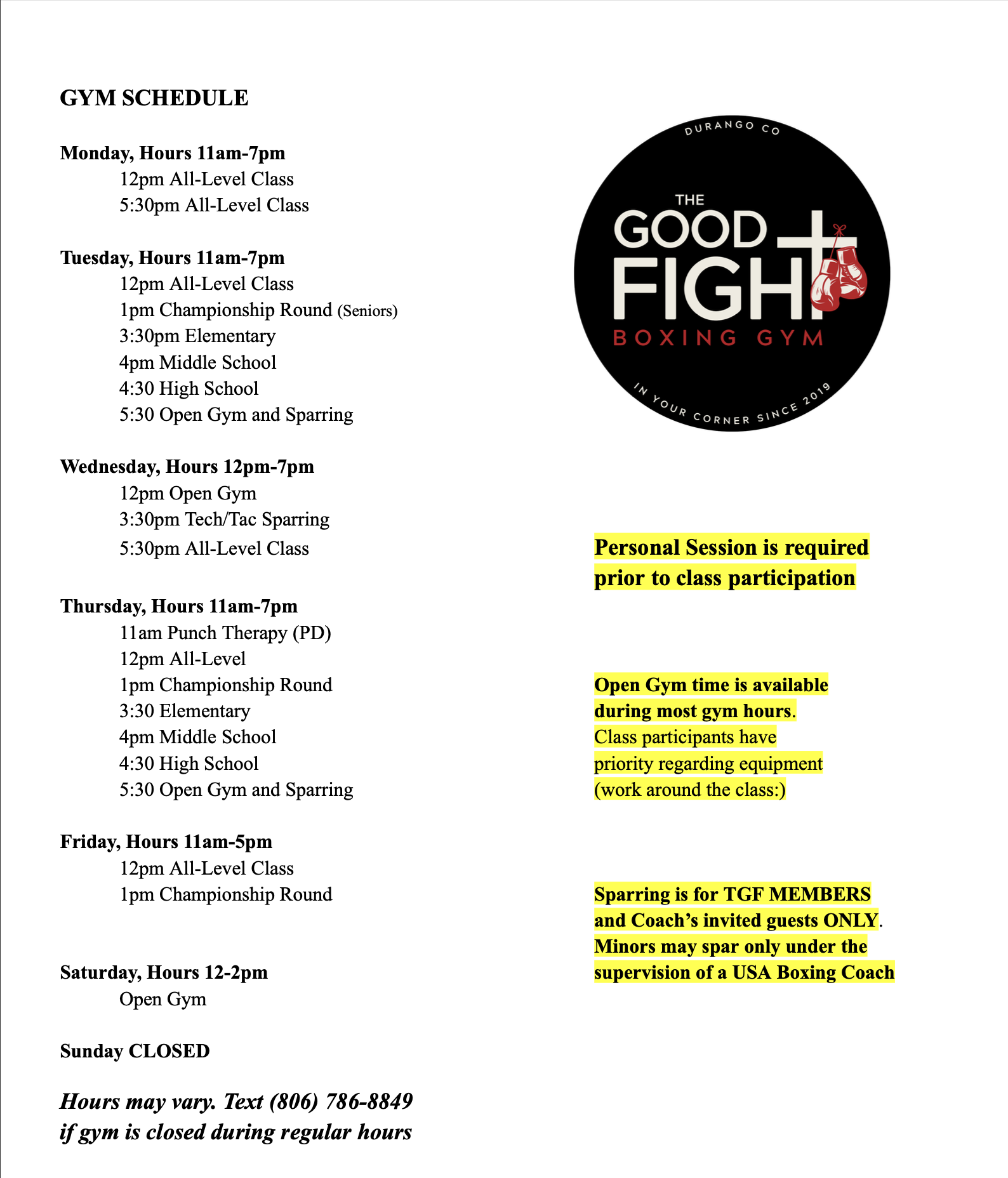 All class times and open gym hours are subject to change.